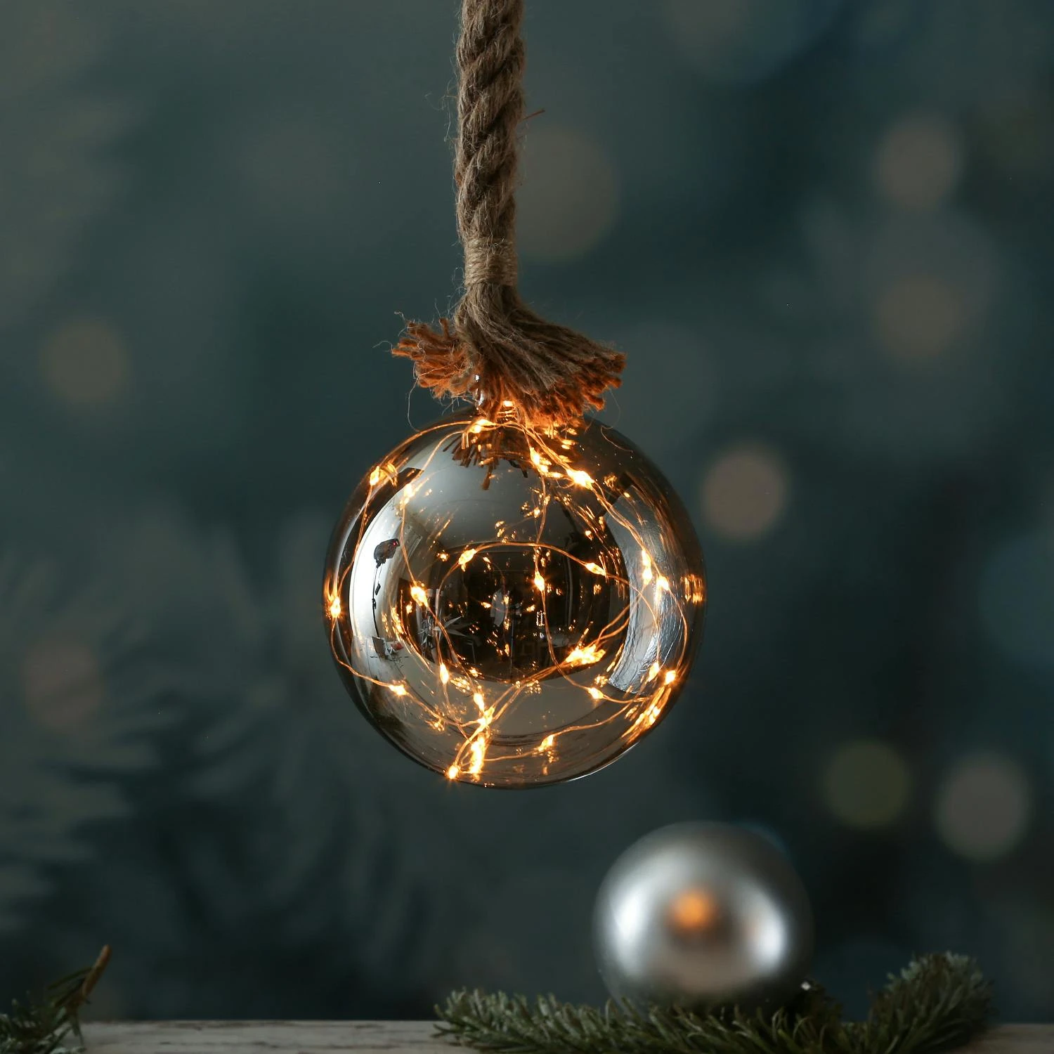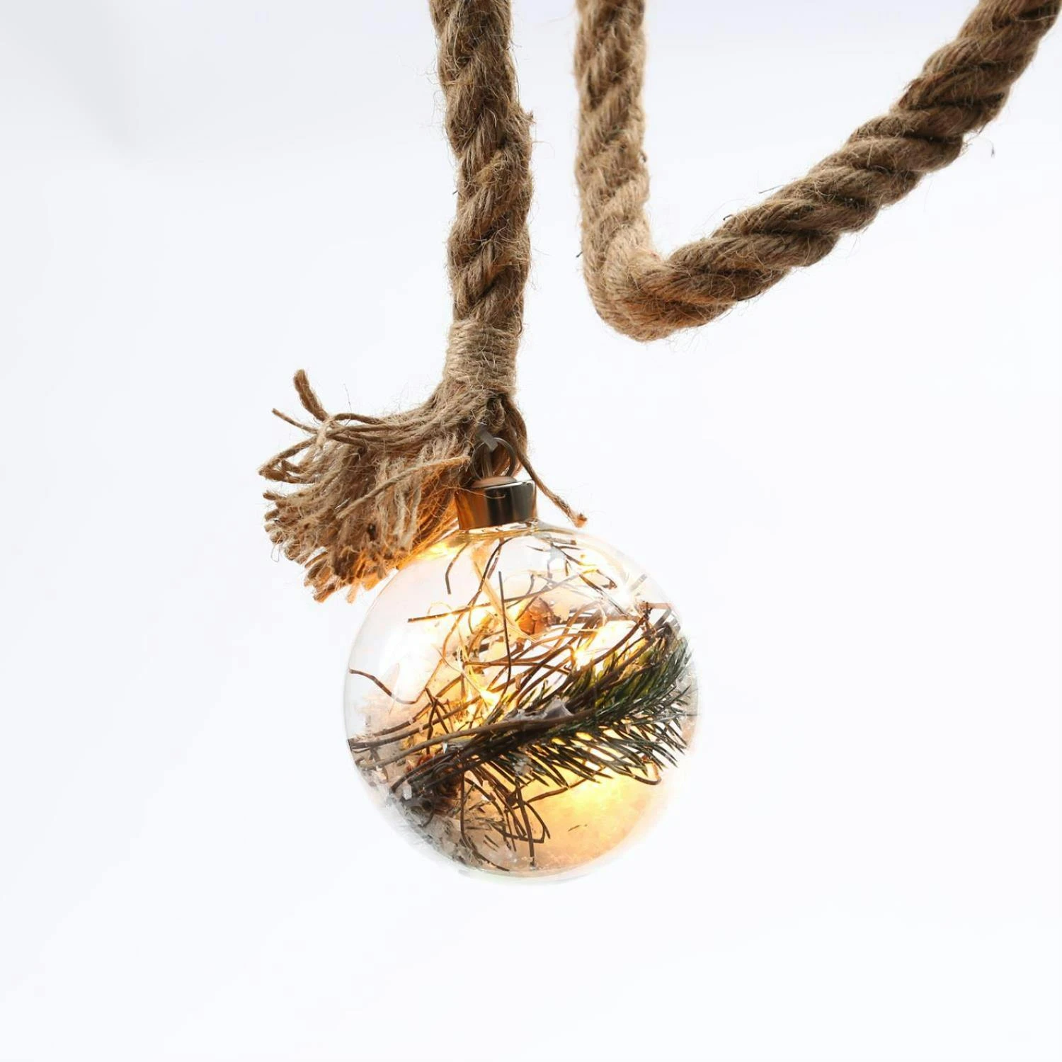 - Glaskugel mit Drahtlichterkette am Juteseil