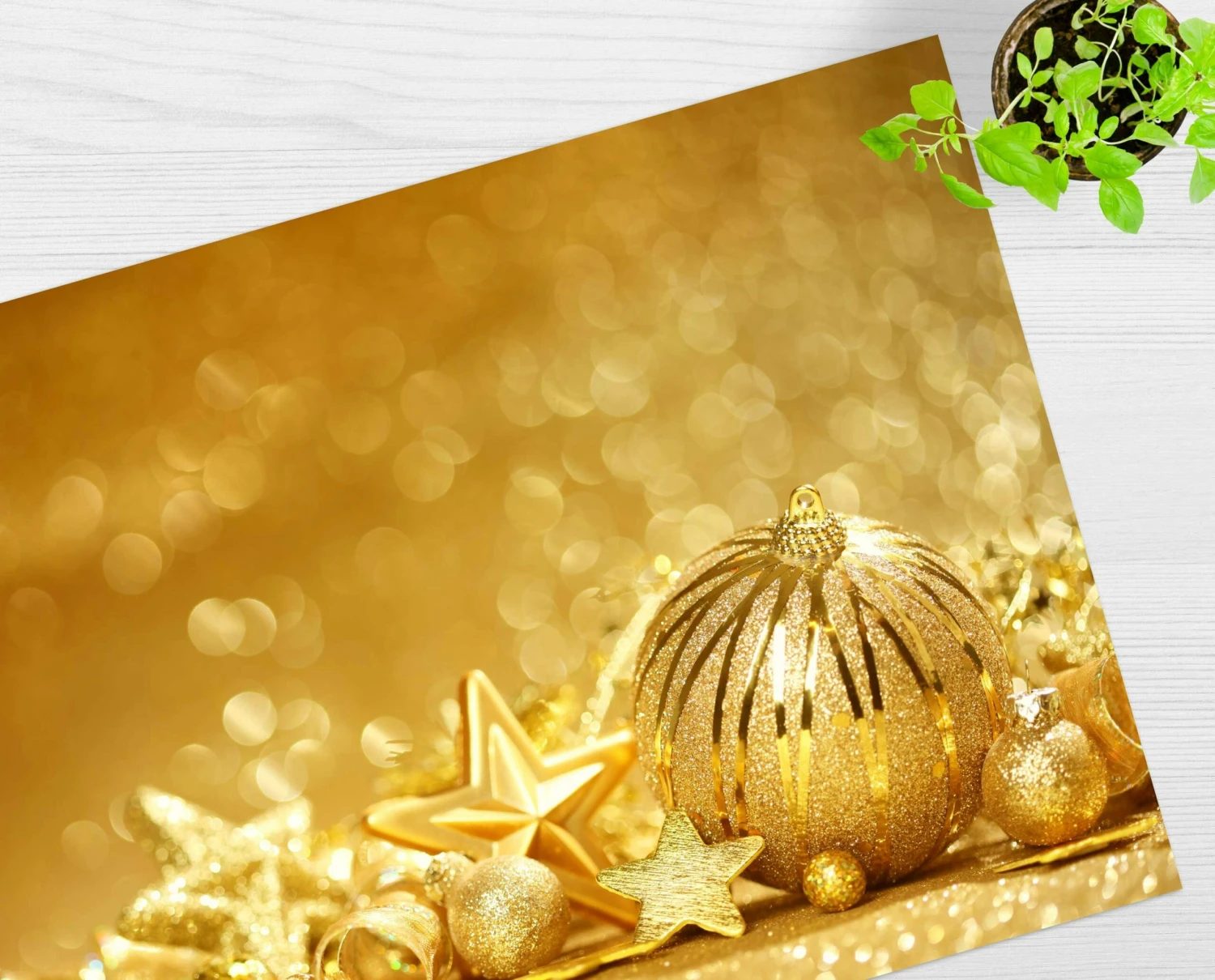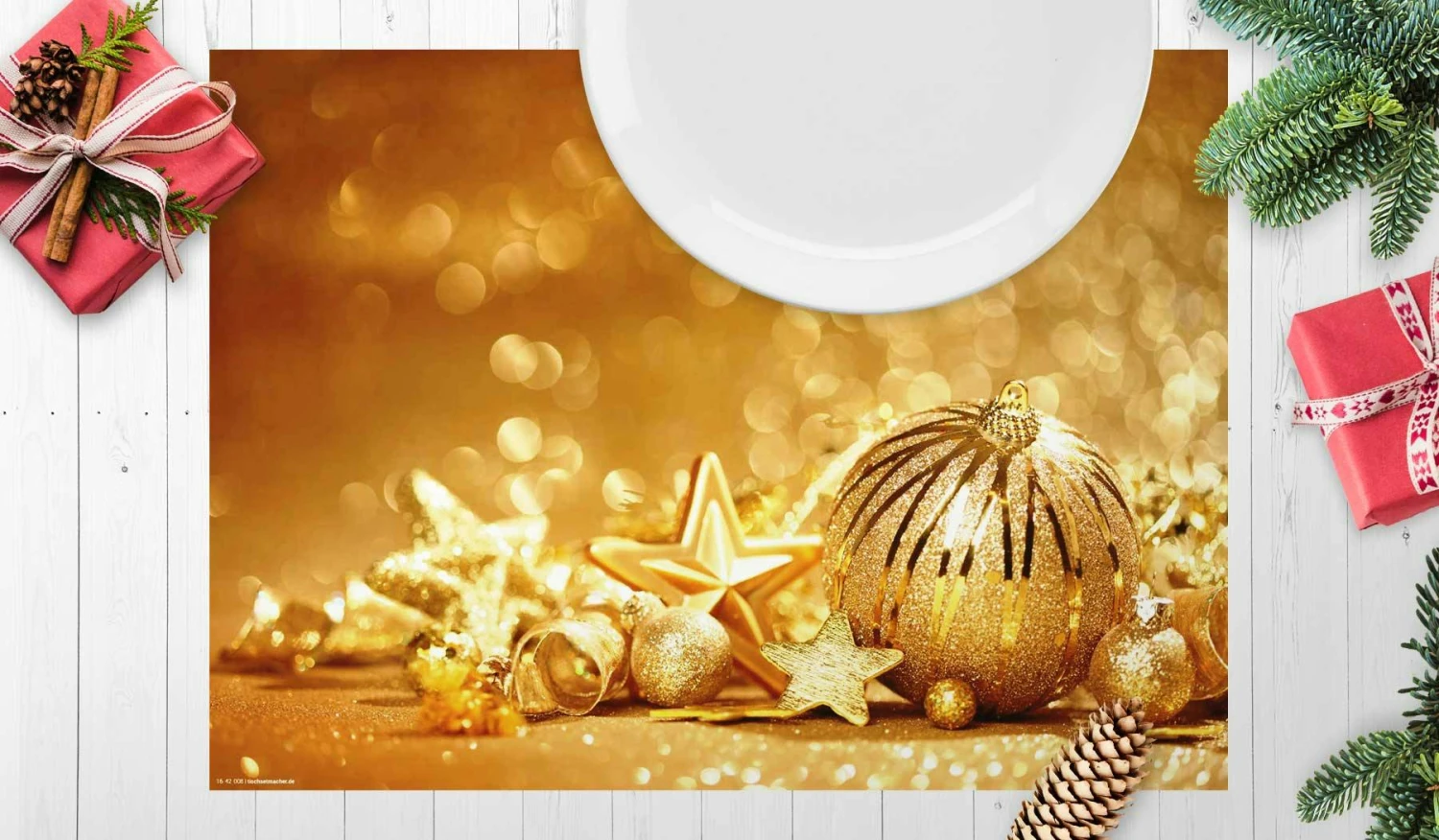 Eine raffinierte Tischdekoration neu definiert. Praktisch und mit Stil ein außergewöhnliches Ambiente zaubern. Wir lieben und leben Tischsets – Made in Germany. Tolle weihnachtliche Tischsets mit Goldene Kugeln. Machen Lust auf die besinnlichste Zeit des Jahres und verwandeln Ihren Tisch in einen echten Hingucker! Im Handumdrehen schaffen Sie eine festliche Atmosphäre voller weihnachtlicher Stimmung und festlicher Vorfreude. Unsere Tischsets sind die ideale Kombination aus Schutz vor Flecken und einzigartiger Tischdekoration mit Stil! Umweltfreundlich, recyclingfähig und je nach Essverhalten auch mehrfach verwendbar. Verpackungseinheit 12 Stück (Größere Auflagen auf Anfrage).